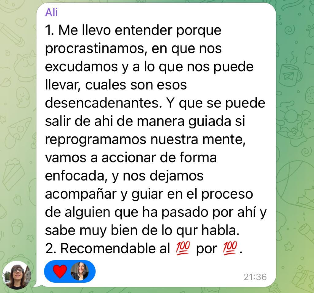 Te puedo garantizar que si realizas todas las tareas que te propongo, asistes con ganas y con conciencia plena a las sesiones en vivo, preguntas todas tus dudas y te pones en acción y llevas a la práctica todo lo aprendido, notarás cambios desde la primera semana.